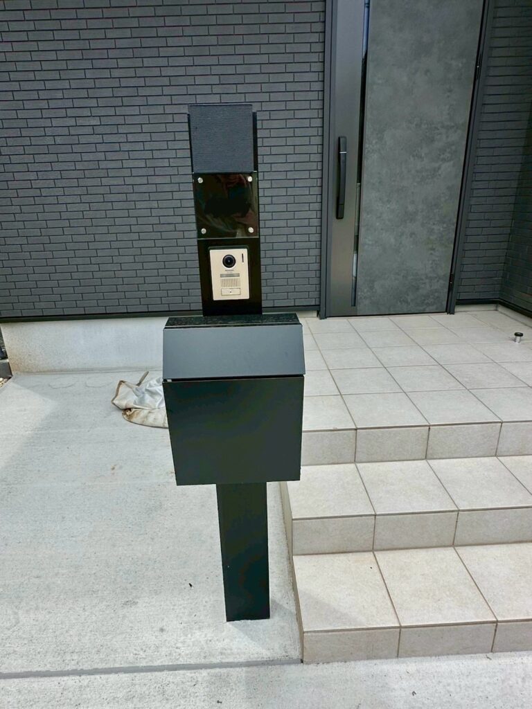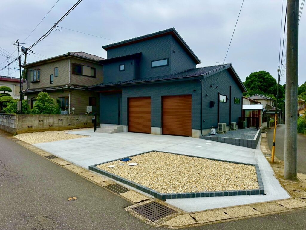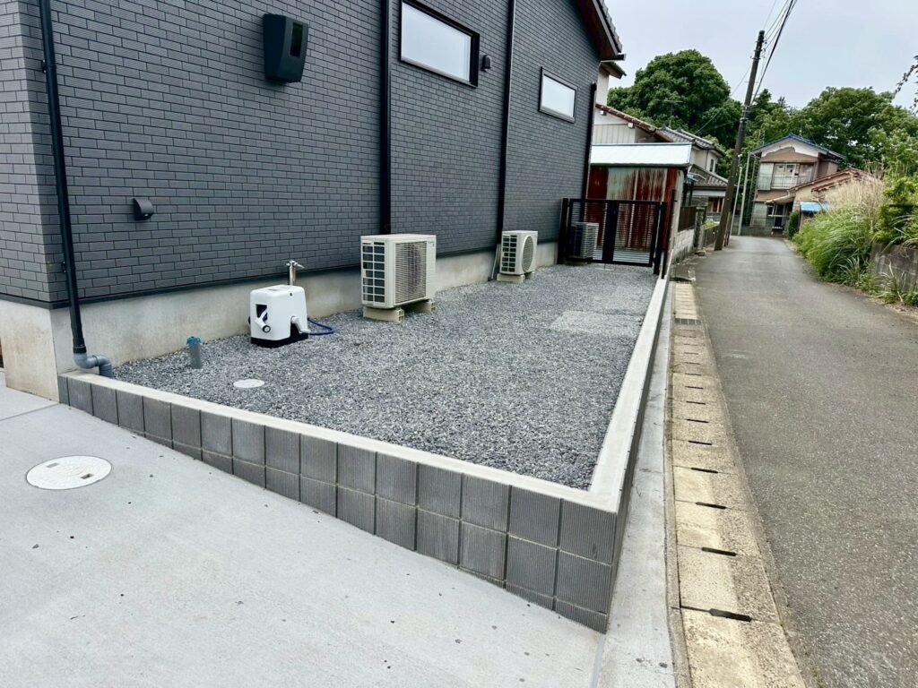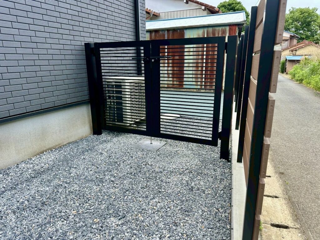 それに合わせ、玄関側も雰囲気を統一するため化粧砂利とし、お庭への入り口を予定していた門扉は、現場調整にて室外機を避け、場所を決めさせていただきました。