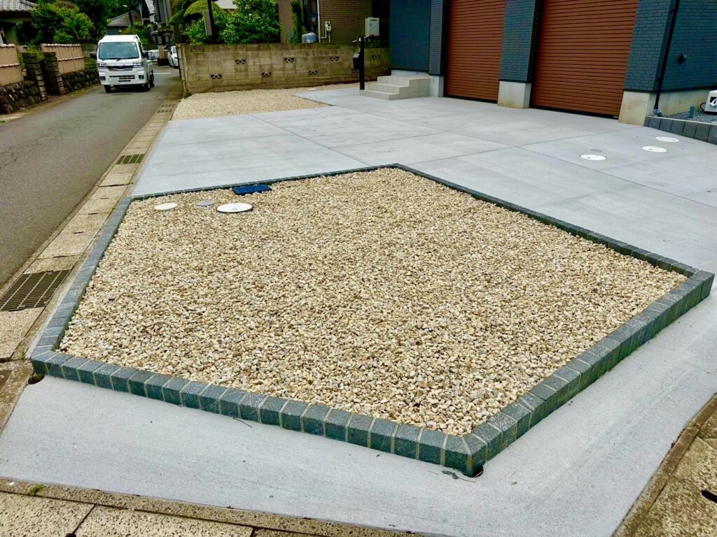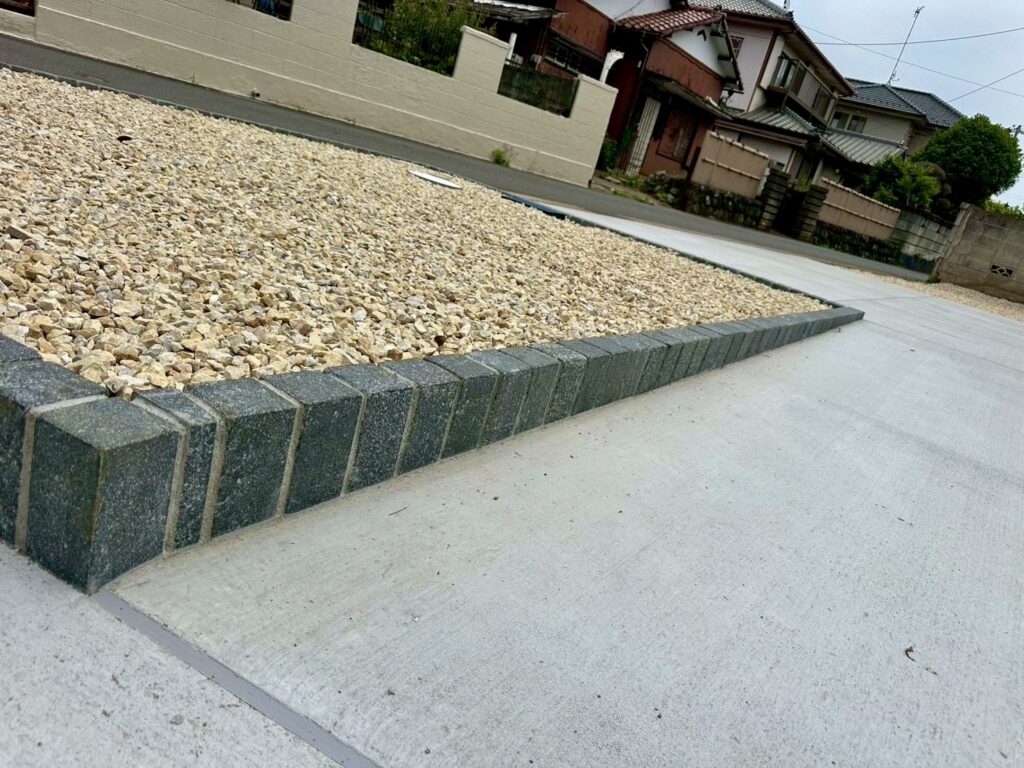 走っている車が日常的に敷地に入ってしまうことを懸念されておりましたので、ピンコロで縁取りをした将来的な植栽スペースを提案させていただきました。
